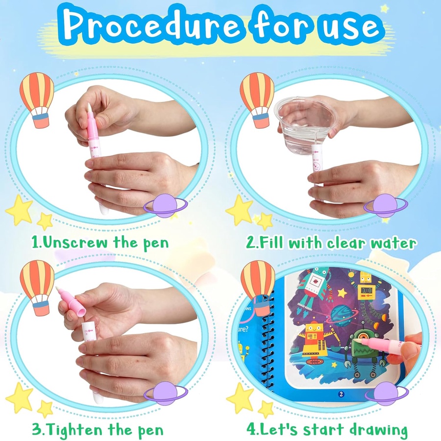 ✔ القلم السحري يُملأ بالماء، والألوان بتظهر وتختفي لما تنشف