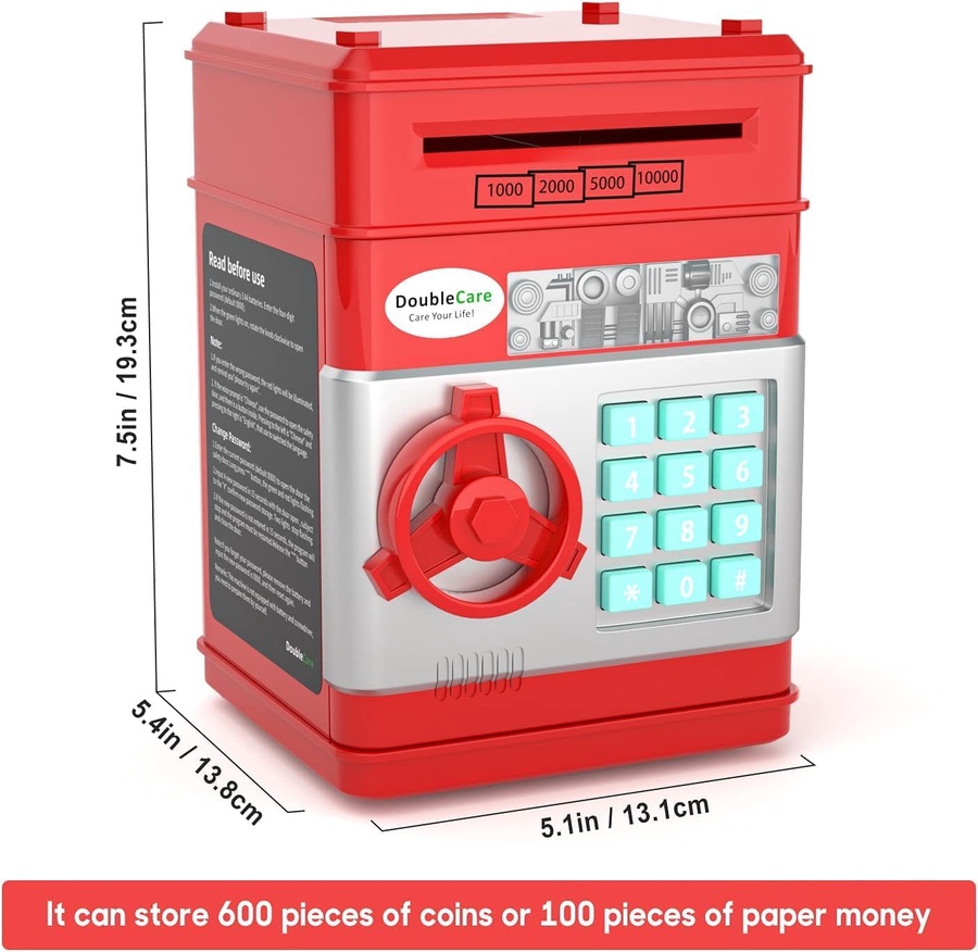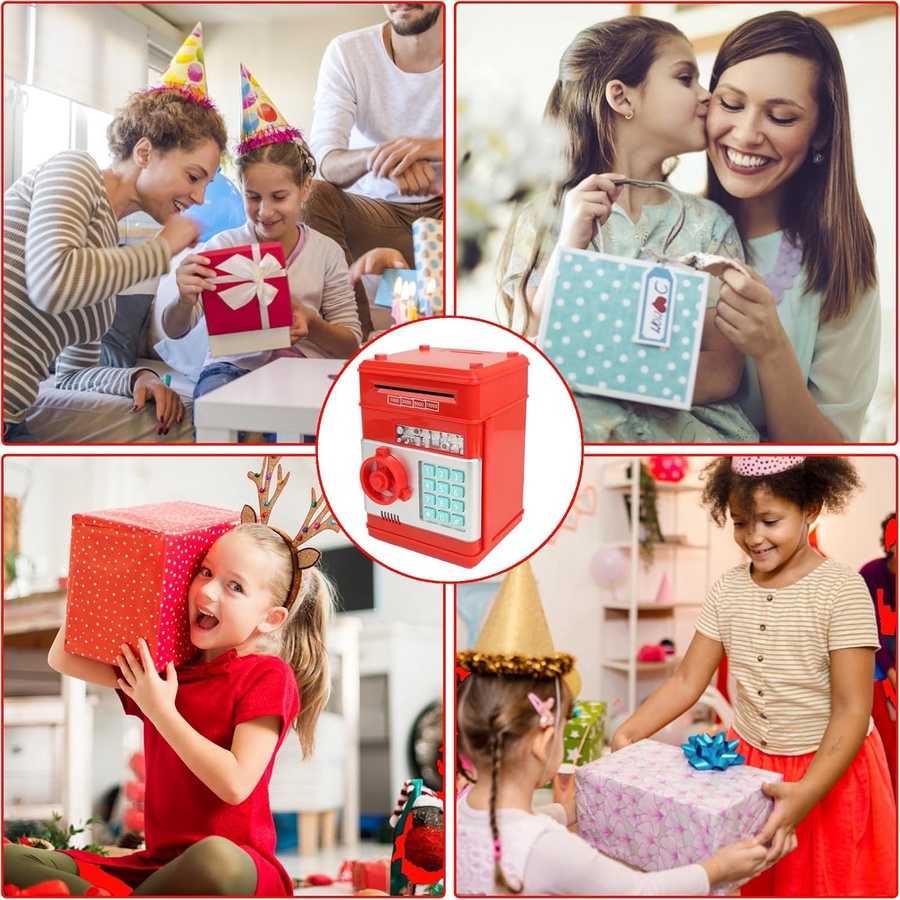 حصالة بتصميم واقعي زي خزنة بنك، بلون أحمر جذاب، وشاشة أرقام بكود سري