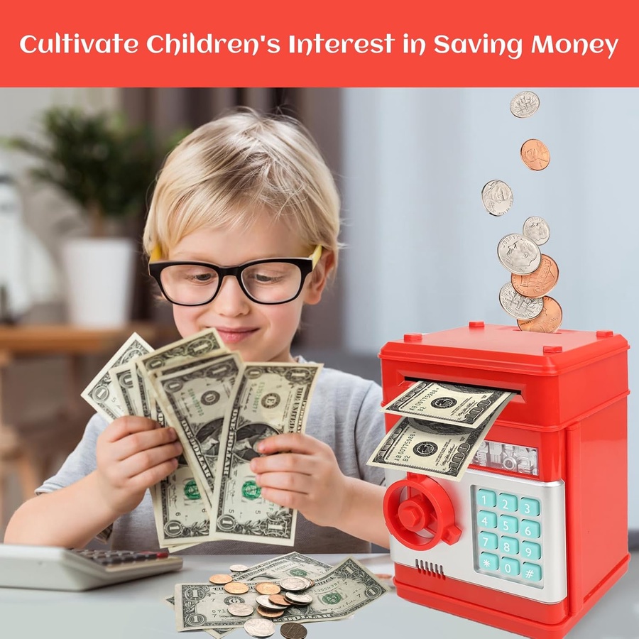 الطفل بيحط فيها الفلوس الورقية أو المعدنية، ويفتحها بالكود، وفي كل مرة تشتغل بصوت وإضاءة تحمّسه أكتر