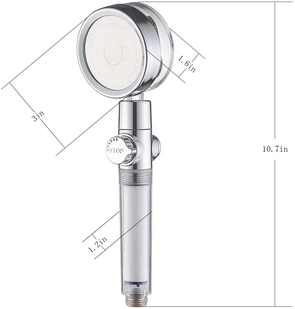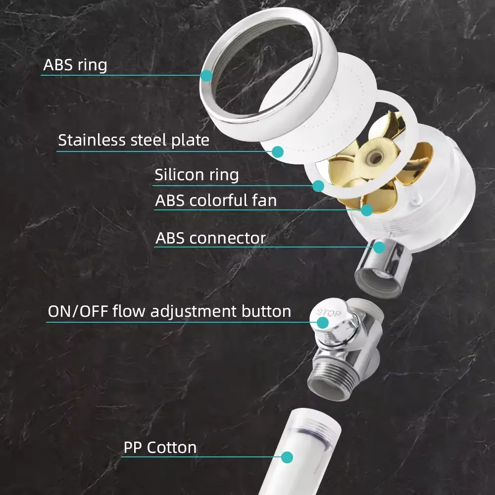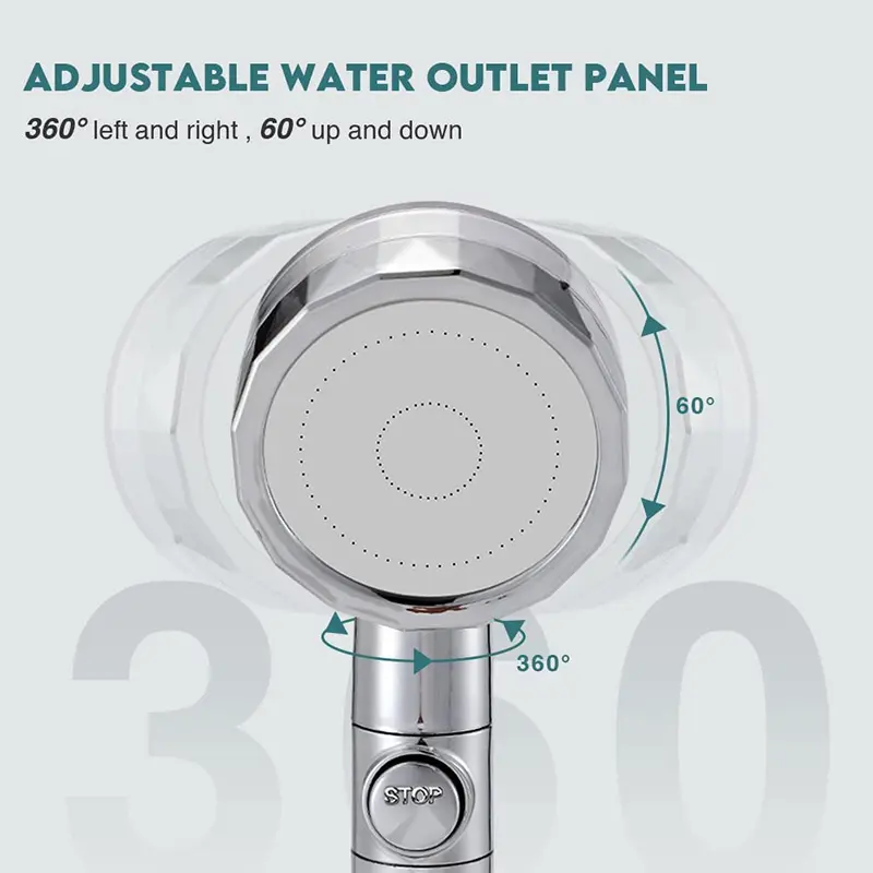 رأس دش تربو بمروحة 360 درجة لزيادة ضغط المياه وتوفير الاستهلاك. تصميم ذكي يوفر مياه ويمنحك استحمام منعش ومريح. متوافق مع جميع الخراطيم.